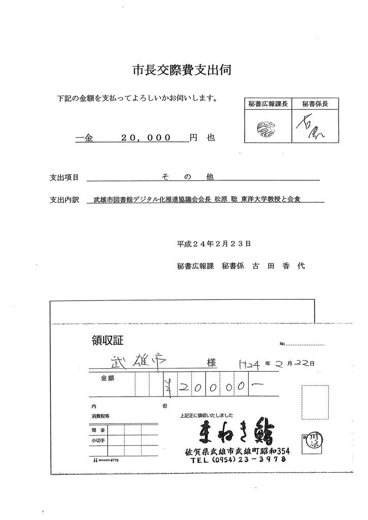 寿司で接待を受けてる領収書が武雄市の公文書で判明